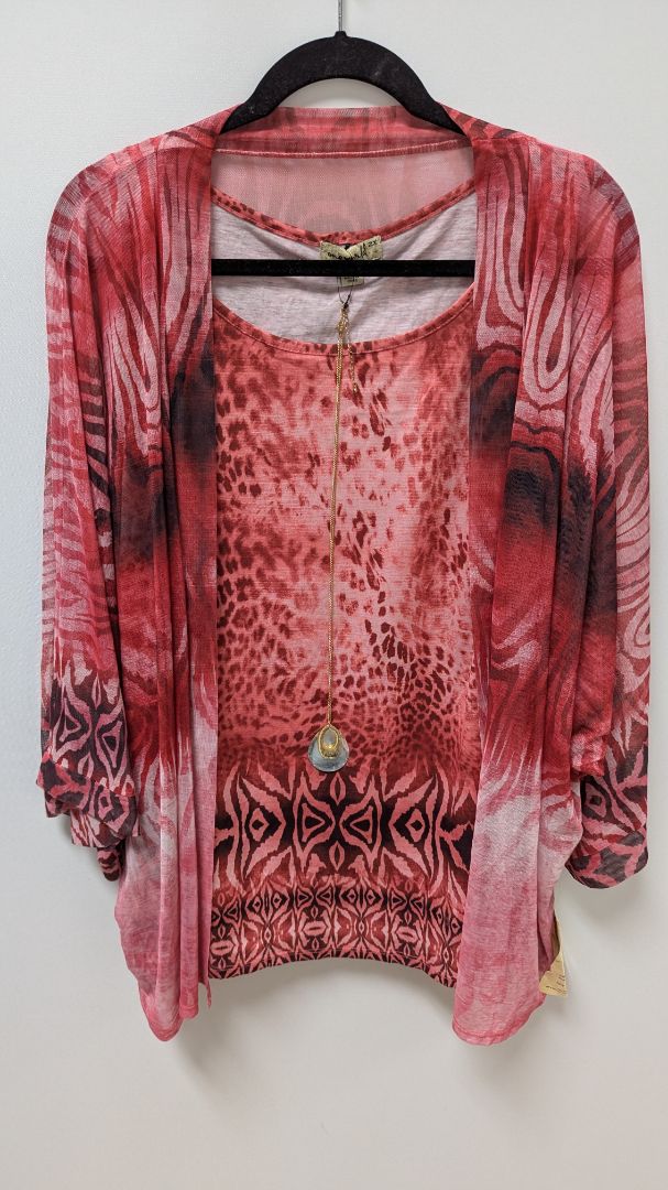 One World Red Mixed Print Combo Blouse & Cardigan with Necklace. Size 2X. New with tags, with minor inherent defects possible. It includes a built-in sleeveless blouse with matching cardigan and gold-colored metal necklace. The cardigan is made of a mesh material and it is stretchy. The sleeveless blouse is also stretchy. Also includes the gold-colored metal longline pendant necklace as 3 piece set.