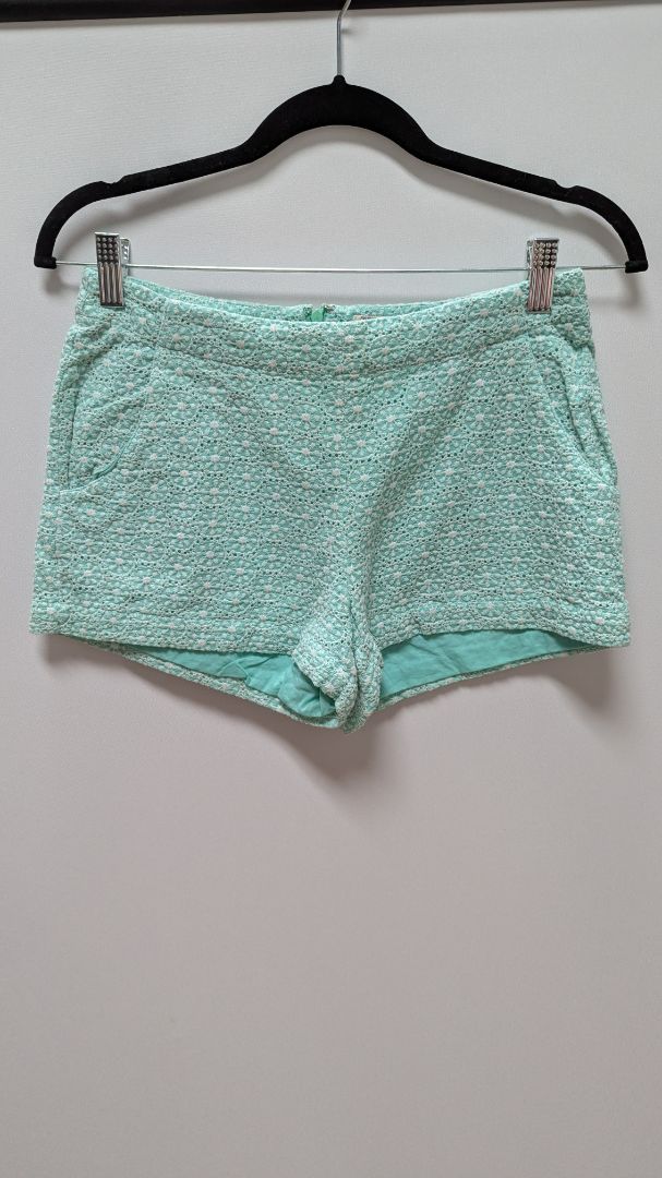 Original Penguin Teal/White Lace Casual Shorts. Size 2. Very gently used, almost-new condition. It is made of a lace material with a lining. It has 2 front pockets and a zippered back with a hook clasp.