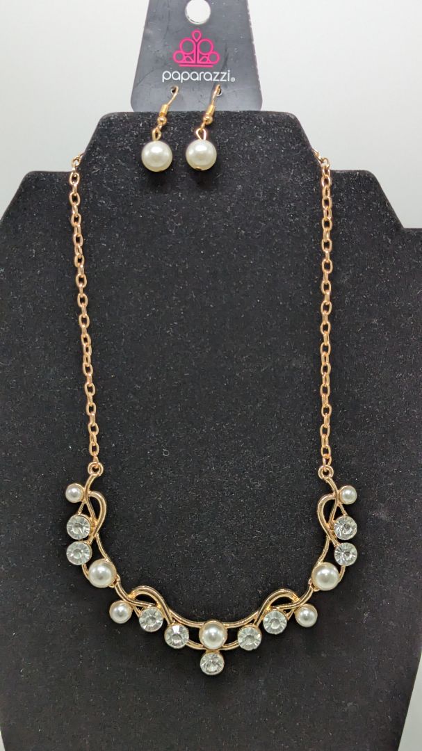 Paparazzi Gold/White/Faux Pearl Twisted Necklace Set. New with tags. It includes both the necklace and matching earrings as a 2-piece set. The necklace has an adjustable chain length with a faux-pearl and faux-gemstone twisted design. The earrings have a dangling style.
