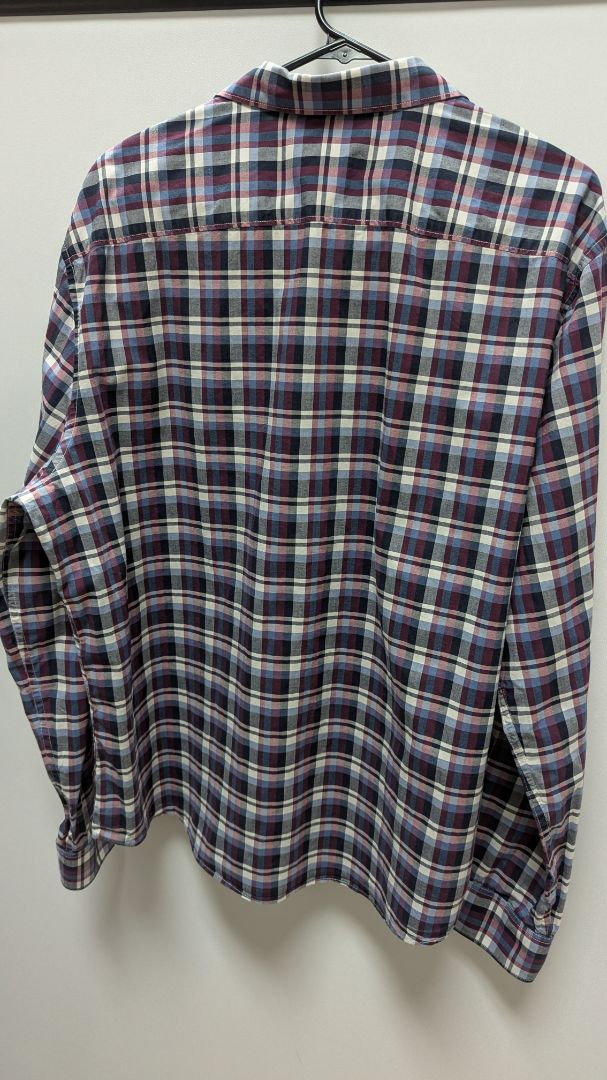 Perry Ellis Stretch Maroon Plaid Button-Down Shirt. Size XXL. Gently used, with some minor spots of wear, spot stains, fraying, and snags. All the defects are very minor and hardly visible without close inspection. It features a button-down front, a collar, and long sleeves.