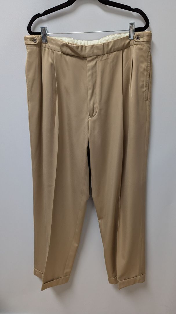Polo Golf Ralph Lauren Light Brown Wide-Leg Chino Pants. Size 36x30. Very gently used; minor inherent defects may be present. It has 4 pockets, a button-adjustable waistband, a zipper and 2-hook front closure, and cuffed hems.