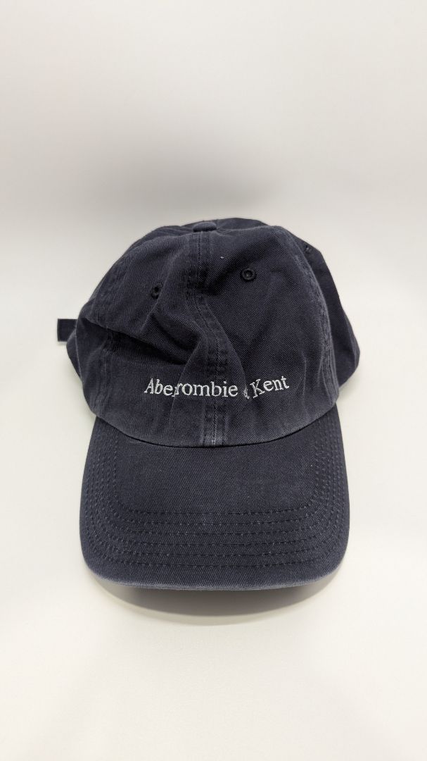R Series Navy "Abercrombie & Kent" Hat. Size One-Size-Fits-Most. Gently used, with some minor staining, but in good condition. It features an adjustable strap in the back for size adjustments.