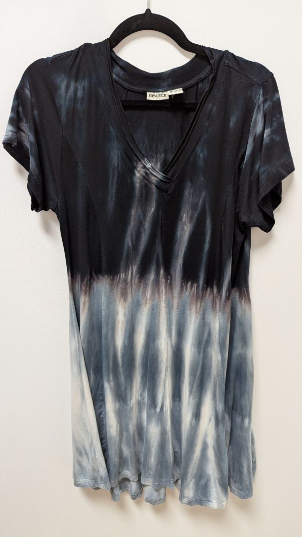 raya sun Grey Tie-Dye Ombre Flared Dress. Size Large/Petite. Gently used, with some minor wear to the material. It also has some small seam defects down the front middle seam and some spotting on the front hem. It has a v-neckline with raw edges, short sleeves, a flared style, ombre tie-dye coloring, and it is made of a stretchy knit material.