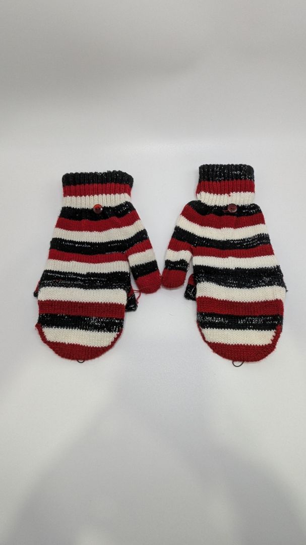 Red/Black/White Striped Convertible Knit Gloves. Gently used. Converts from mitten style to fingerless style gloves. There is a button on each glove cuff to hold back the mitten-style end when not in use.