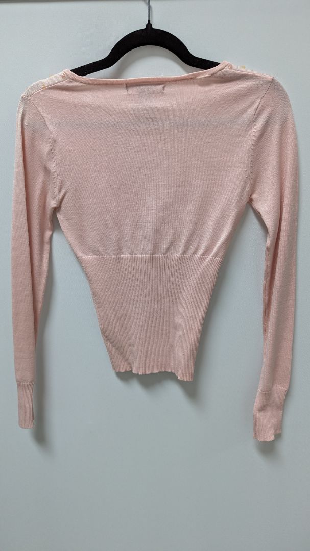 Say What? Pink Y2K Sequin Silk-Blend Sweater. Size Small. Gently used, with some minor staining on one shoulder; some minor snags are also present. It has a faux-wrap neckline with sequin embellishments, long sleeves with ribbed cuffs, and a ribbed knit waistband and hem. It has a snug fit.
