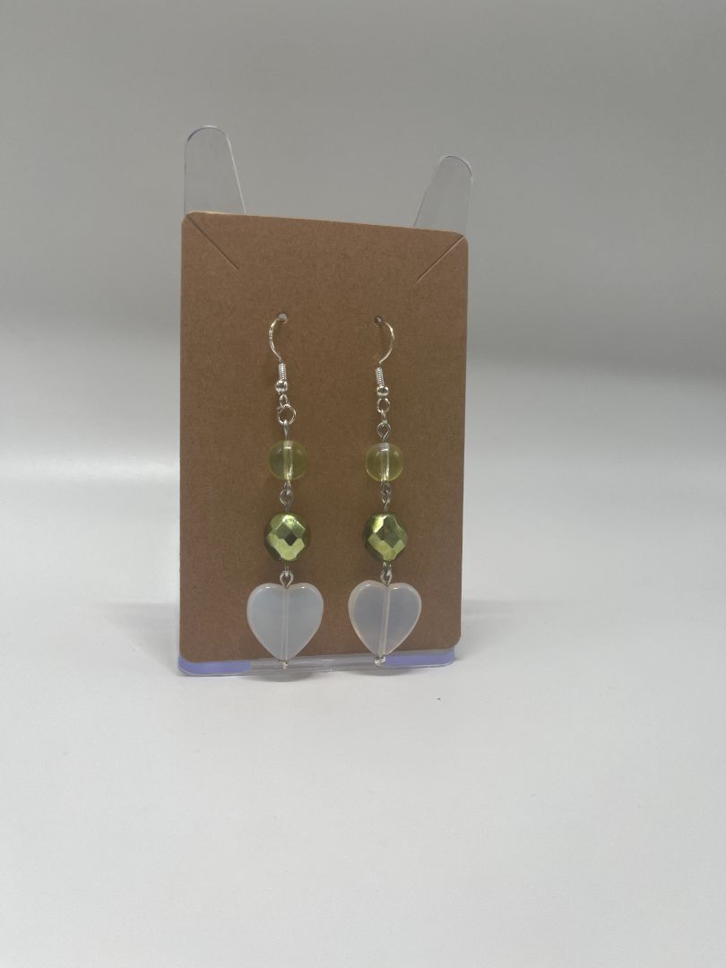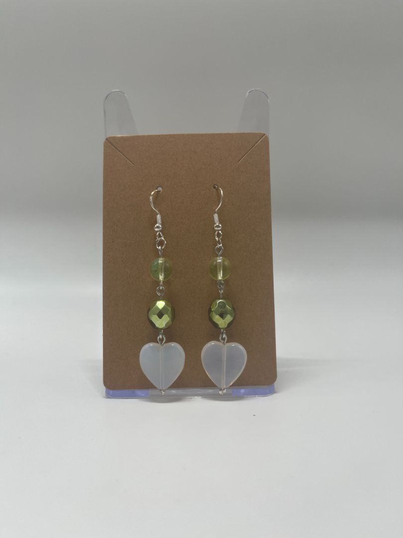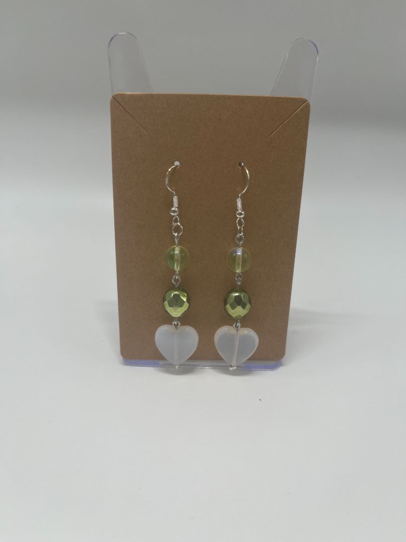 Hand-crafted from assorted glass beads with silver accents and hardware. Two different shades of green, with white/clear hearts.