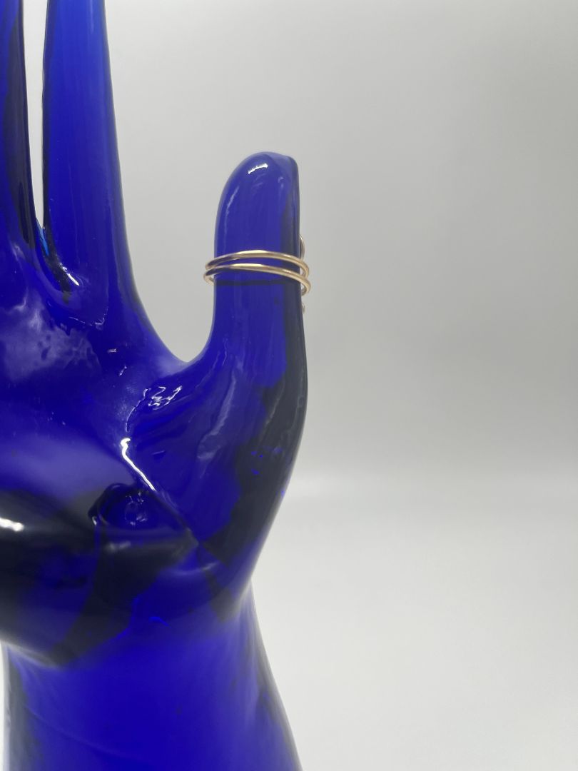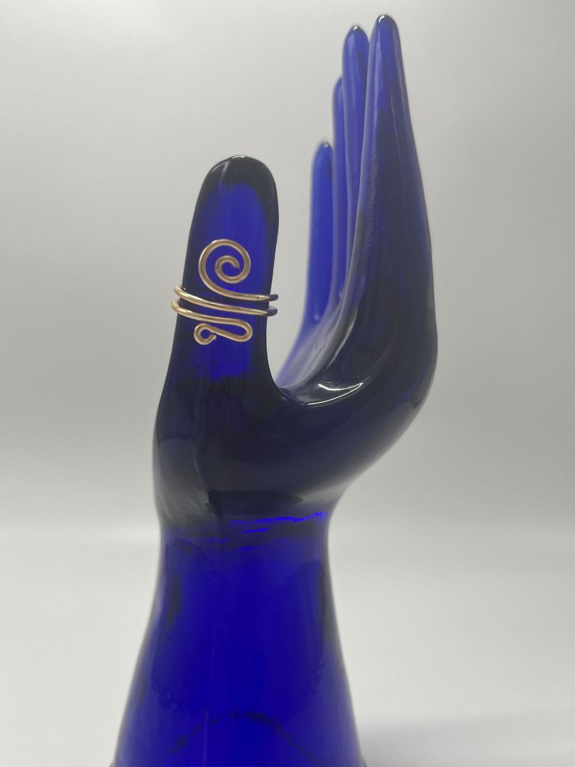 Size 6 Wire ring - darker hue gold( non-yellow); ability to be adjusted for the perfect fit.