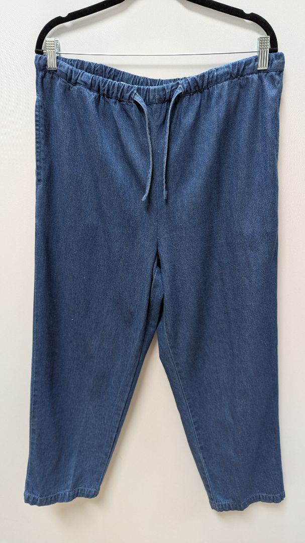Stephanie Andrews Medium Wash Wide-Leg Jeans. Size 10. Gently used, with some minor spotting and snags; in overall great condition. It has a drawstring/elastic waistband, a wide-leg style, and 2 pockets. Includes 1 pair of jeans. The other pieces of the set are sold separately.
