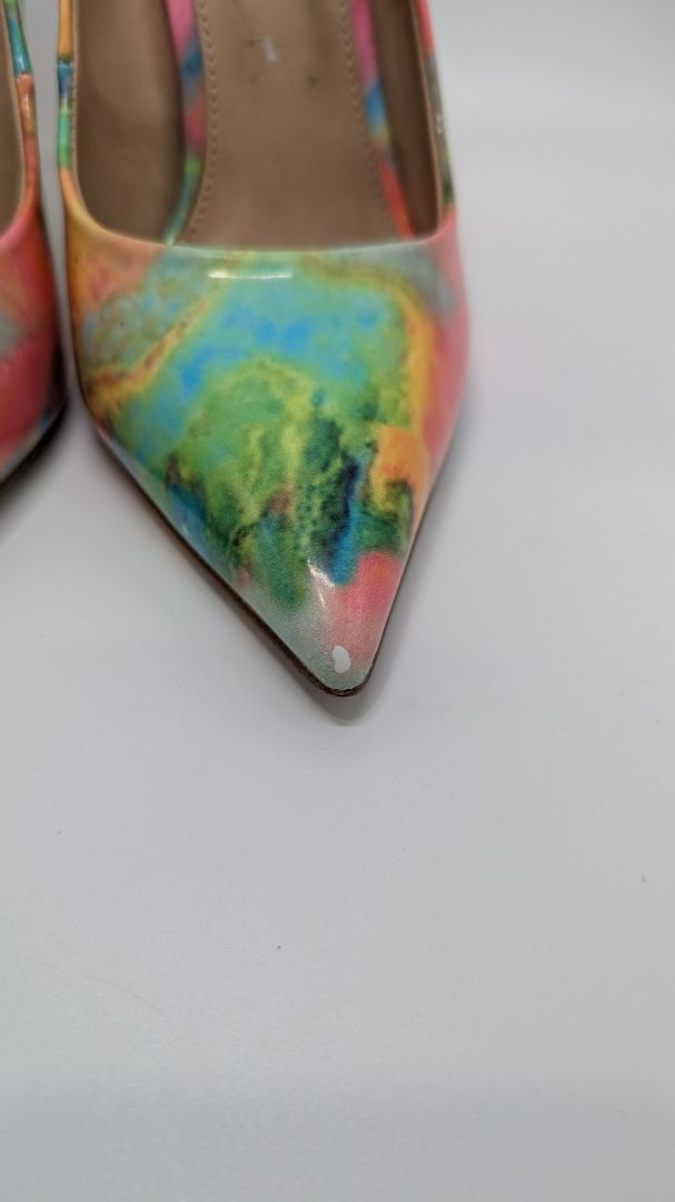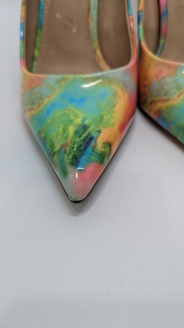 Steve Madden Multicolor Watercolor Daisie Pumps. Size 8M. Gently used, with some wear to the inner and outer soles; overall good condition. There are also some minor markings on the exterior and the toes. It has a watercolor/tie-dye print.