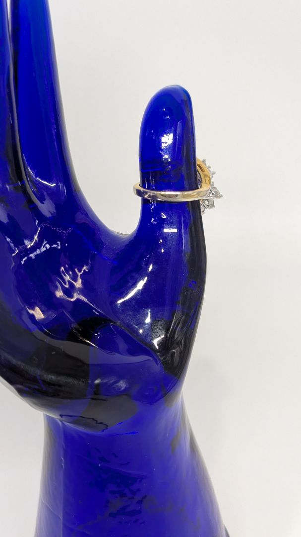 Thin Gold Ring with Large White Gemstone Cluster. Ring size 7. Gently used, with some slight tarnishing, but in great vintage condition.