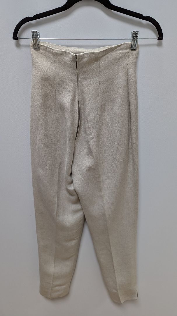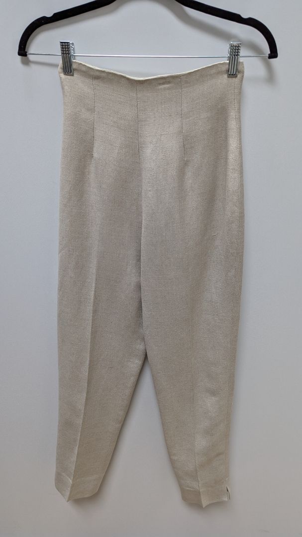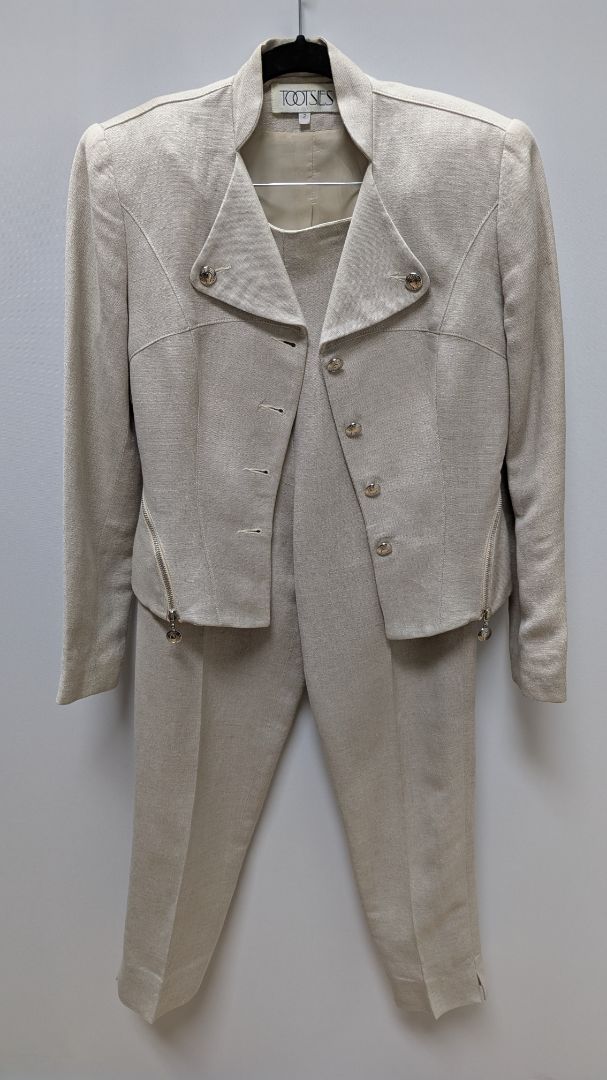 Tootsies Vintage Light Beige Zippered Blazer & Pants Suit Set. Size 2. Gently used, with minor discoloration/snags; in great vintage condition. It has silver metal detailing, functional zippers on both sides of the waist, a straight leg pant style, a zipper closure in the back on the pants, and the blazer has shoulder pads.