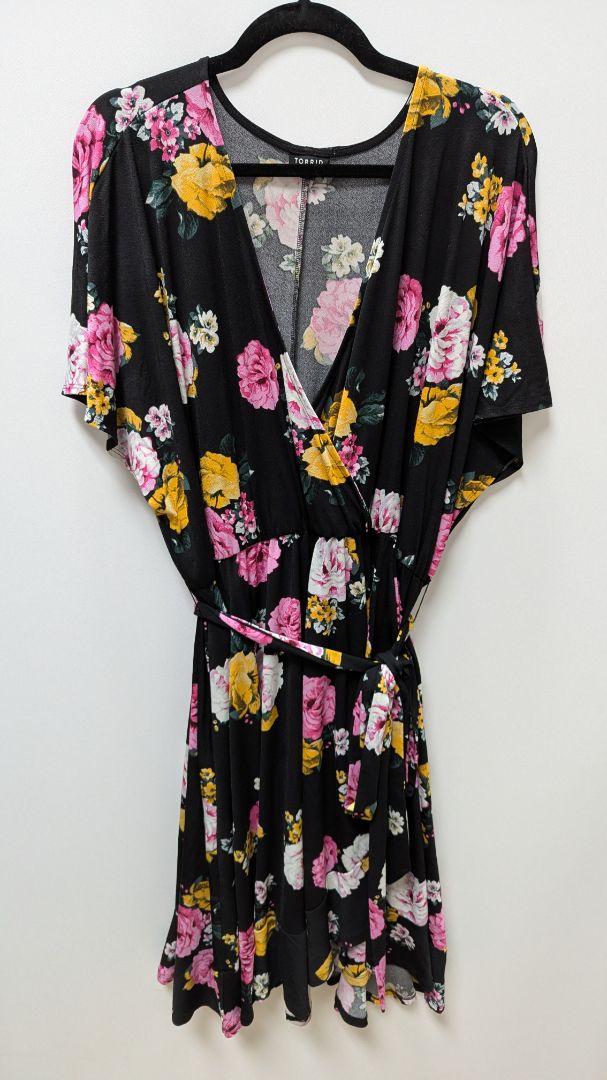 Torrid Black Floral Faux-Wrap Midi Dress. Size Torrid 4 (4X). Very gently used, and includes the matching waist tie. It has a faux-wrap style, short kimono sleeves, a midi length, and an elastic waistband.