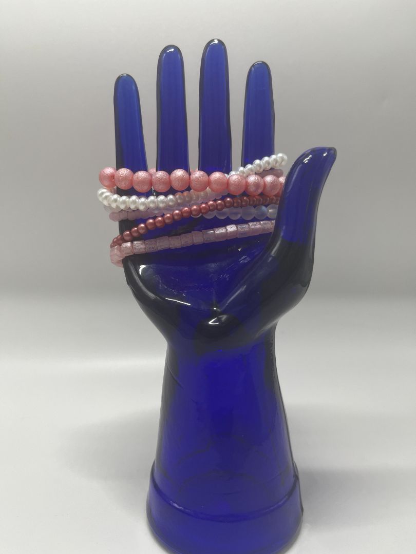 Hand-crafted from an assortment of glass & acrylic beads. Colors range from imitation pearl, clear/iridescent, light pink, dark pink, and sparkly pink.