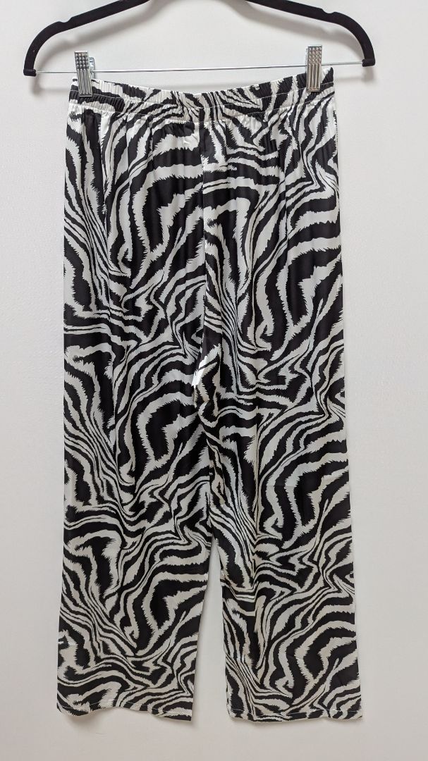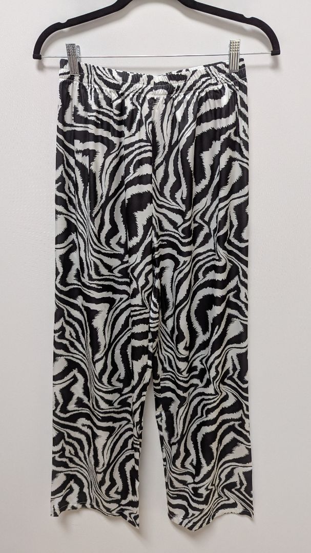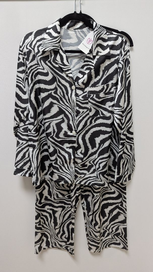 WearLegend Black/White Zebra Striped Button-Down Blouse & Pants Set. Size Large. New with tags. It features a button-down front blouse with long sleeves and a collar. The pants have an elastic waistband and straight leg cut. The material is thin and lightweight, but not sheer. There is 1 chest pocket on the blouse.