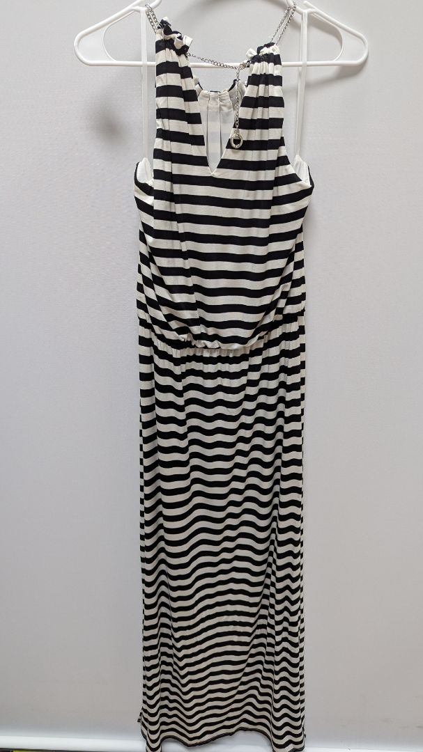 White House Black Market Black/White Striped Maxi Dress. Size Medium. Gently used, with some minor discoloration to the armpits. It has silver metal detailing, a halter-neck style with chains, a maxi length, an elastic waistband, and slits on both sides of the bottom of the skirt portion.