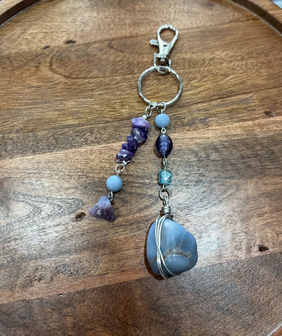 Wire-Wrapped Angelite & Amethyst Chip Communication Beaded DangleBag Charm/Keychain
