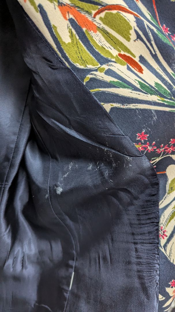 Zara Basic Navy Floral Cropped Sleeve Blazer Jacket. Size Small. Very gently used, with some minor staining to the interior. It has shoulder pads, cropped sleeves, an open-front style, and 2 faux pockets.
